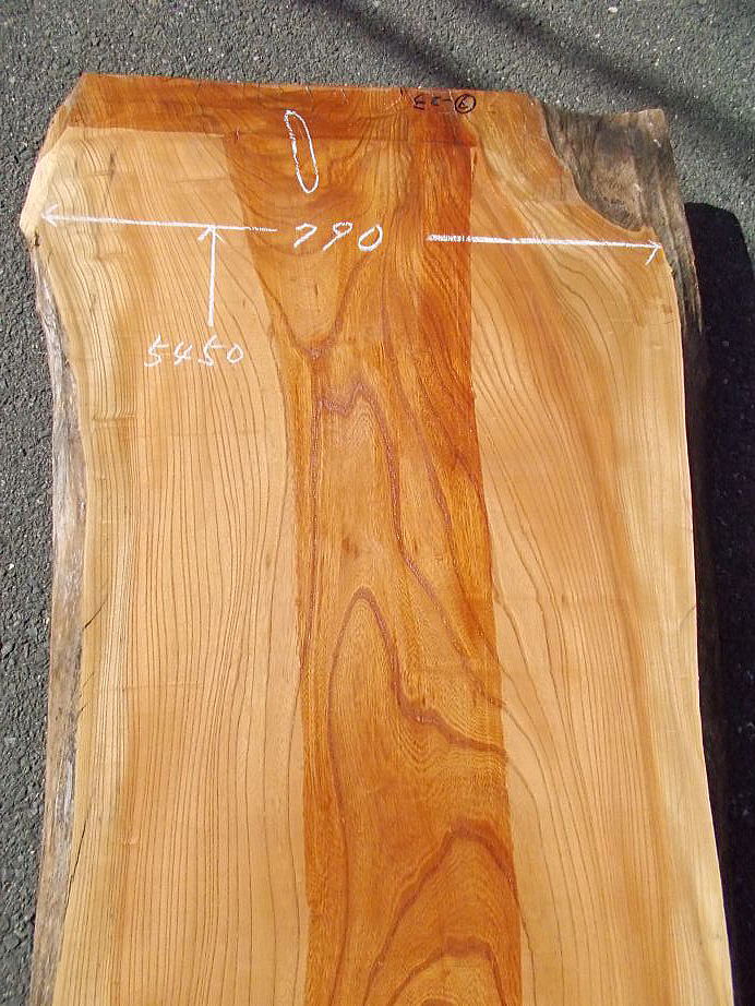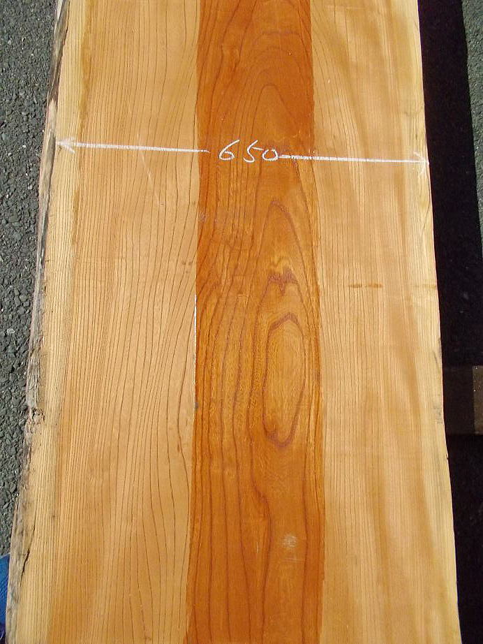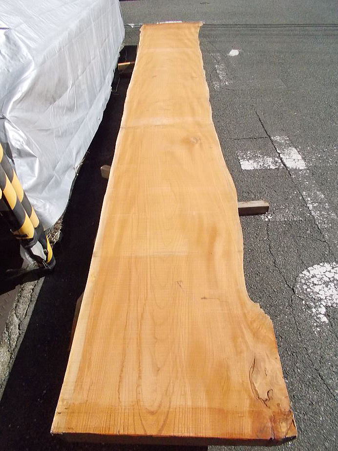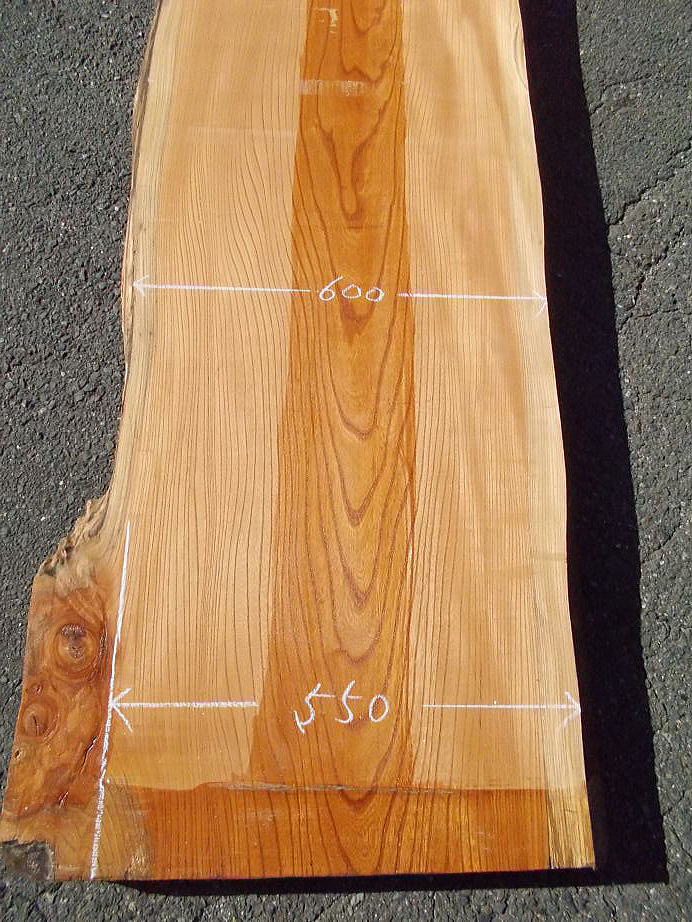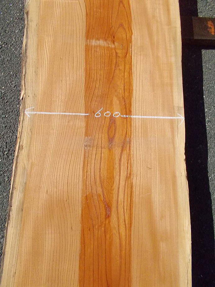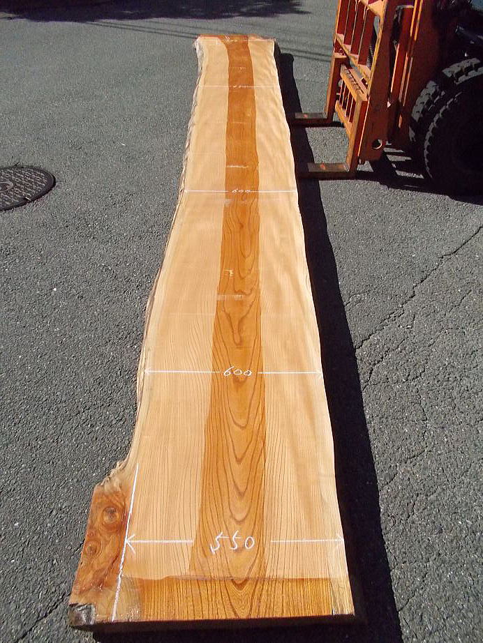 ![]() おもて面 (4〜5mm程の幅反りがあります。左側白太辺りにセンコウ虫穴があります。) (奥から4700mmは幅600mmあります。) ![]() 裏面 (芯割れはありません。) |