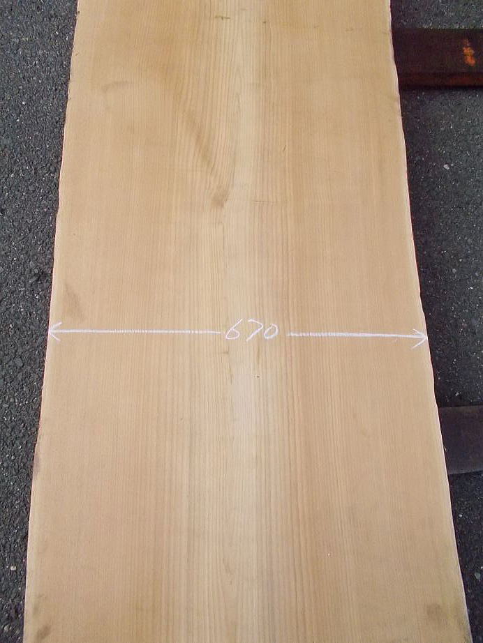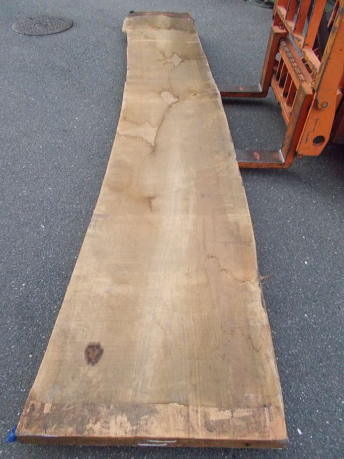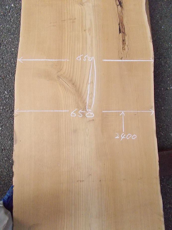 ![]() おもて面 (L=3980mmの場合 27mm程の縦反り、L=2620mmの場合 9mm程の縦反りがあります。) (ハナ割れ・節・干割れ・センコウ虫穴があります。) ![]() ![]() ![]() ![]() おもて面拡大 (22〜27mm程度の逆反りがあります。割れ・節・腐れ等があります。) |