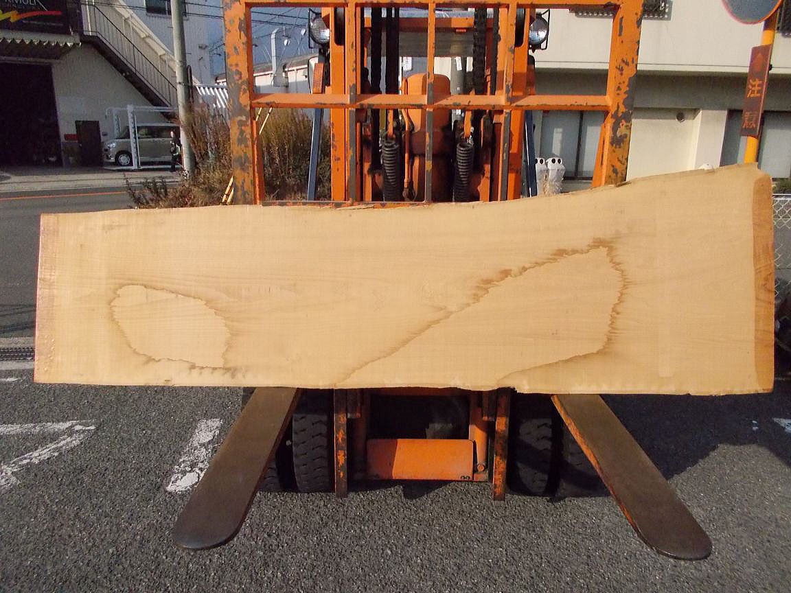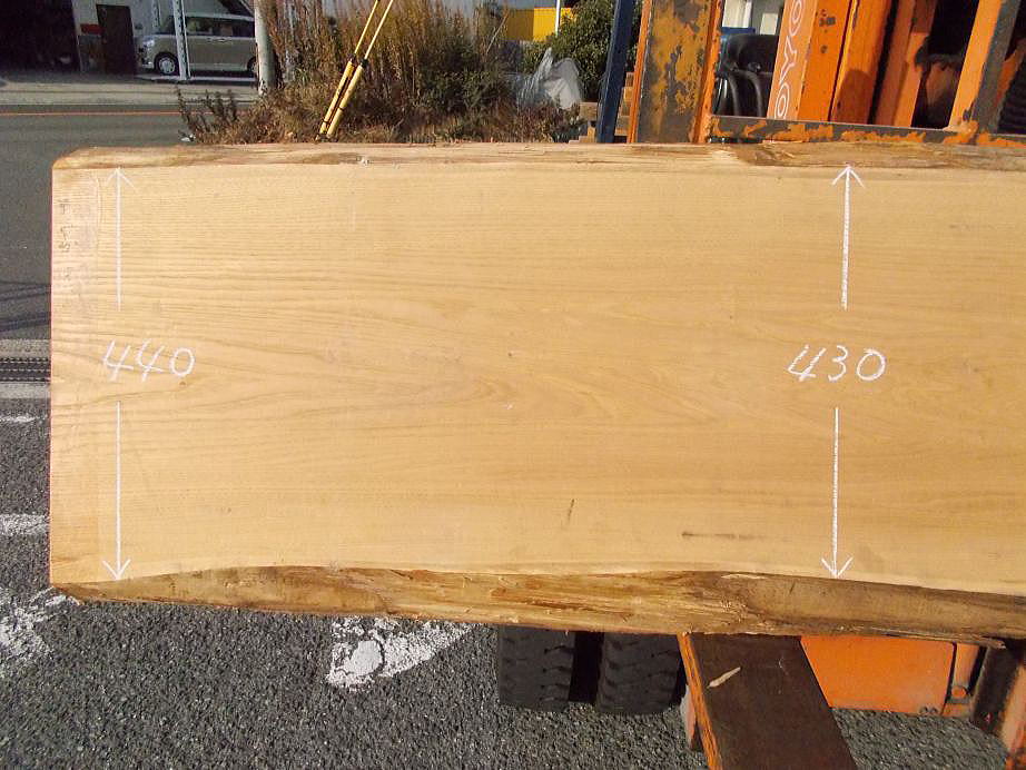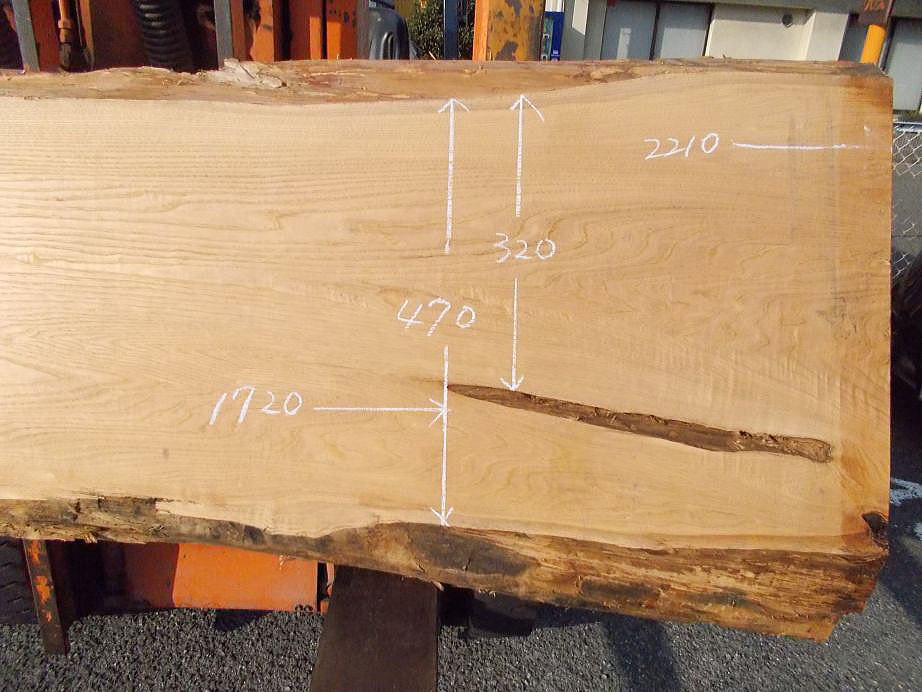 (長さ1720mmで3〜4mmの反り、長さ2210mmで7〜8mm程度の反りひねりがあります。右側に入り皮の窪みがあります。)