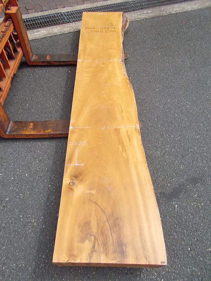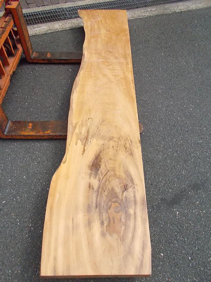 ![]() おもて面 (面白い縮み杢がありますが、穴埋めや節・色変りも有ります。) (手前の割れを外して長さ2030mmで縦反りが有ります。) ![]() 反対面 (面白い縮み杢がありますが、穴埋めや節・色変りも有ります。) |